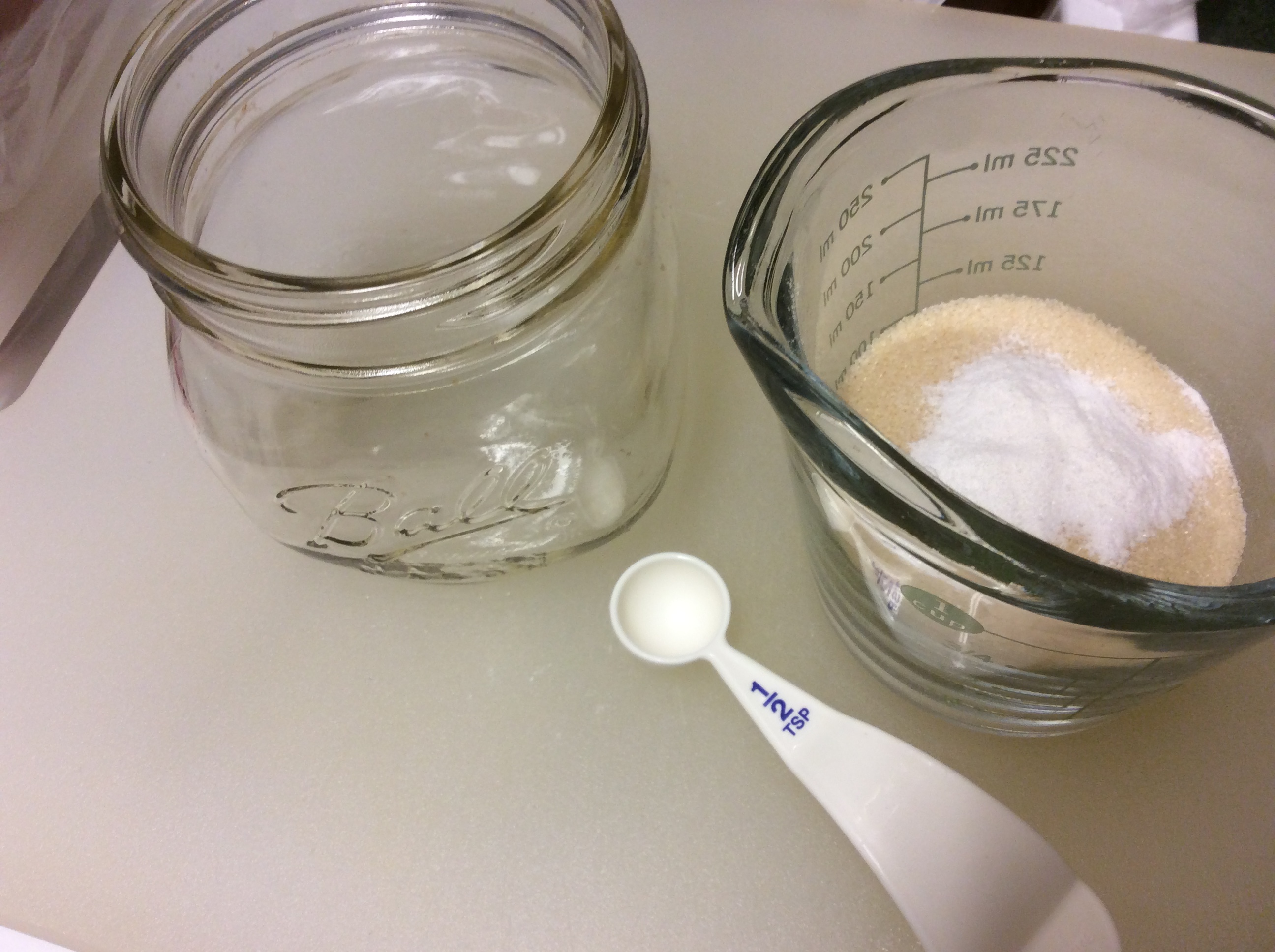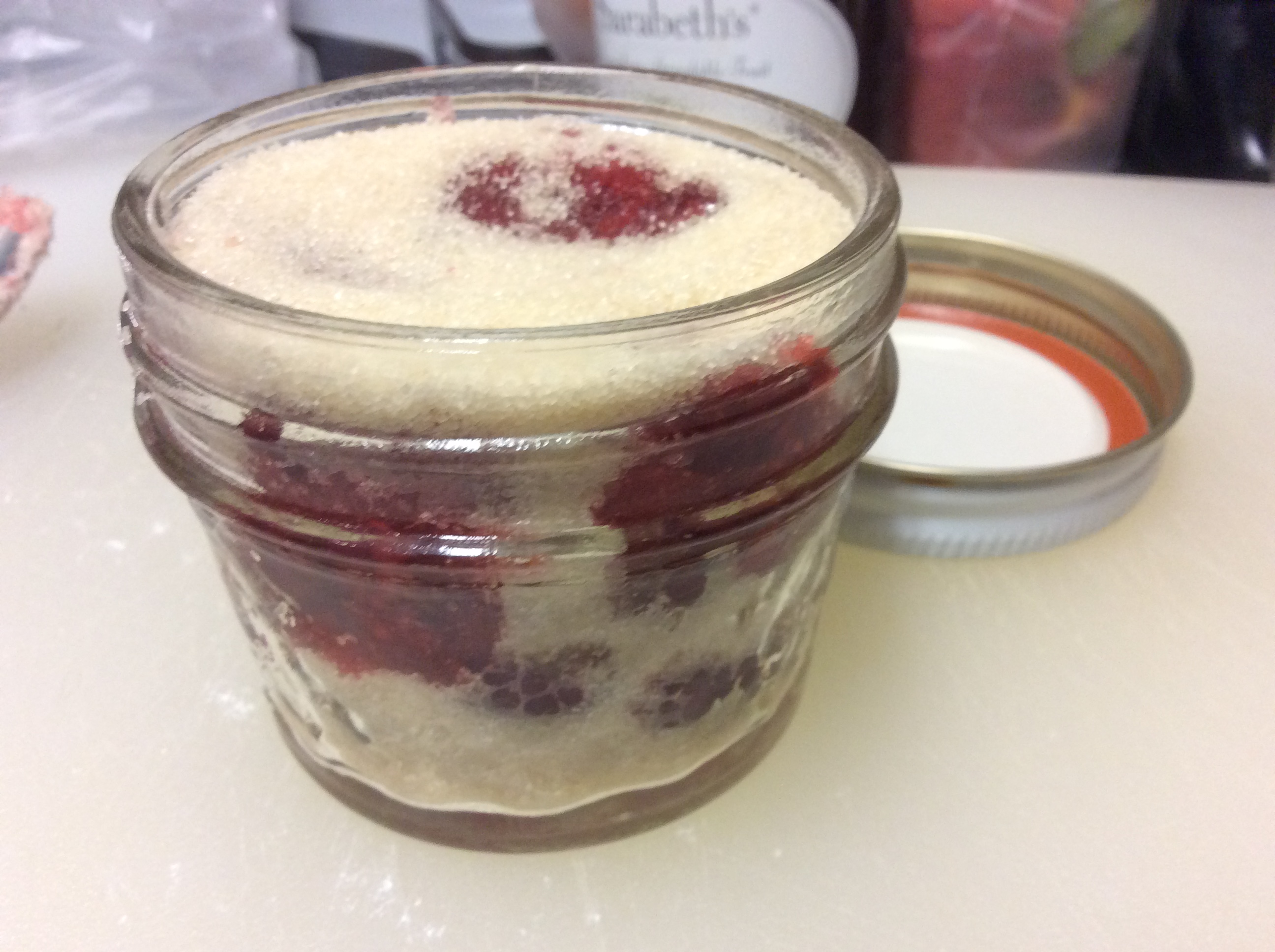 Put a layer of sugar in the bottom of a mason jar. Then add a single layer of raspberries, then another layer of sugar. Repeat until you’ve used all your ingredients or until the jar is full. Try to finish the last layer with sugar so that the raspberries are covered. Since we aren’t cutting up the raspberries, press lightly on the top to squish the raspberries a little. This will help get the juices flowing. Cover and store in the fridge, stirring occasionally, as the sugar draws out the raspberry juice. Scientifically the solution is trying to reach a balanced concentration of sugar and water. Juices flow out of the fruit through osmosis. This reduces the free water in the fruit which slows spoilage when kept in the fridge. Keep stirring periodically until the sugar dissolves. It can take several days.