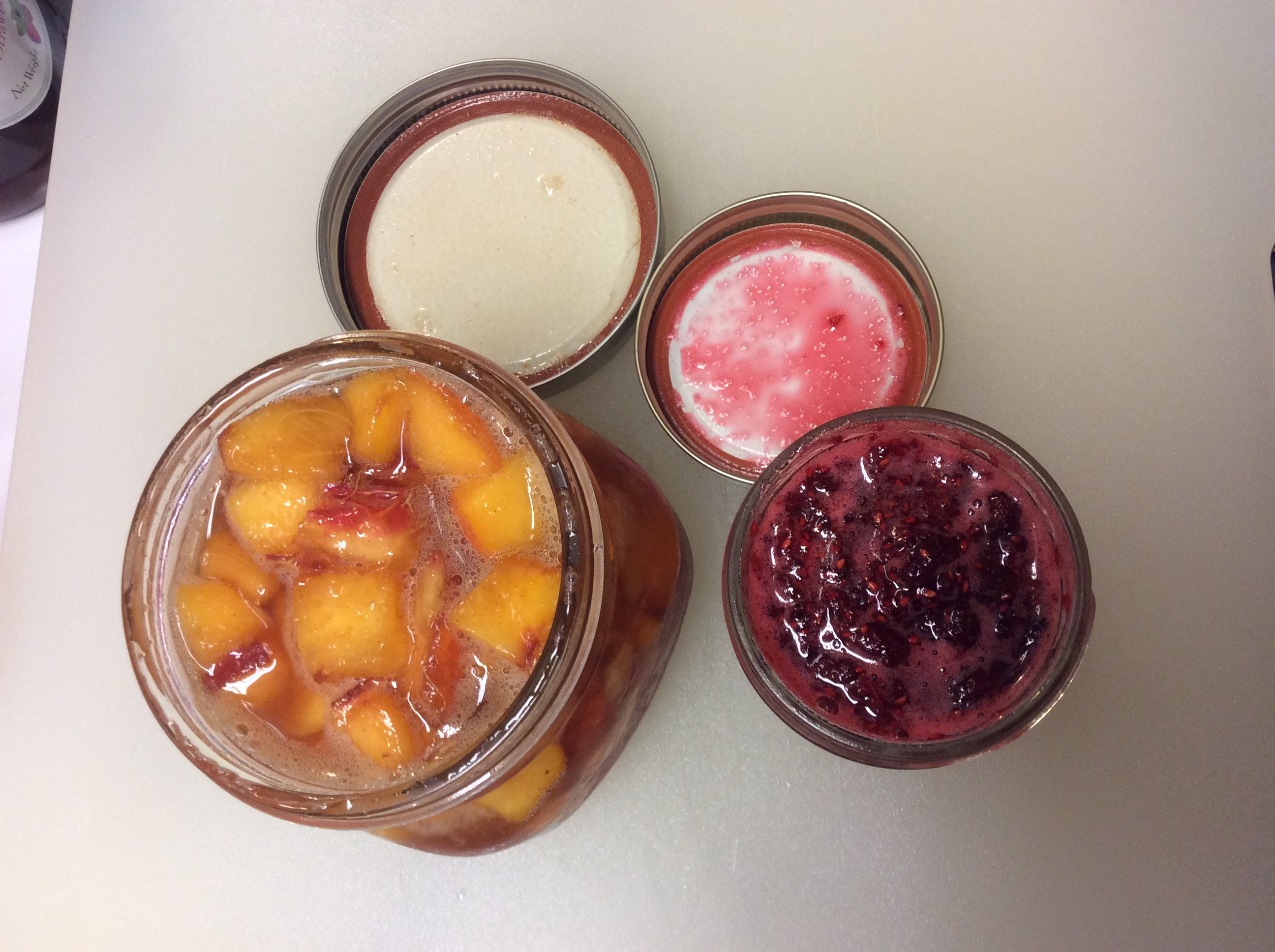 Mix the Fruit Fresh powder into the cup of sugar. Using a clean, sanitized mason jar put a layer of the sugar mix in the bottom of the jar. Spoon a layer of sliced peaches over the sugar. Add another layer of sugar mix over the peaches. Repeat until you’ve used all the peaches and sugar or until the jar is full but not overflowing. Finish the last layer with sugar so that the peaches are covered. Put the lid on the mason jar and allow the sugar to dissolve in the peach juice. The sugar will draw the juice out from the peaches and then gradually dissolve. There will be a lot of juice! This can take quite a few days (even a week) since we’re not using heat to speed it up. Air from between the peach pieces and granules of sugar will slowly bubble out. In the first few days, stir the sugar up from the bottom once or twice per day to help it along. (Lick the spoon. It’s yummy.)