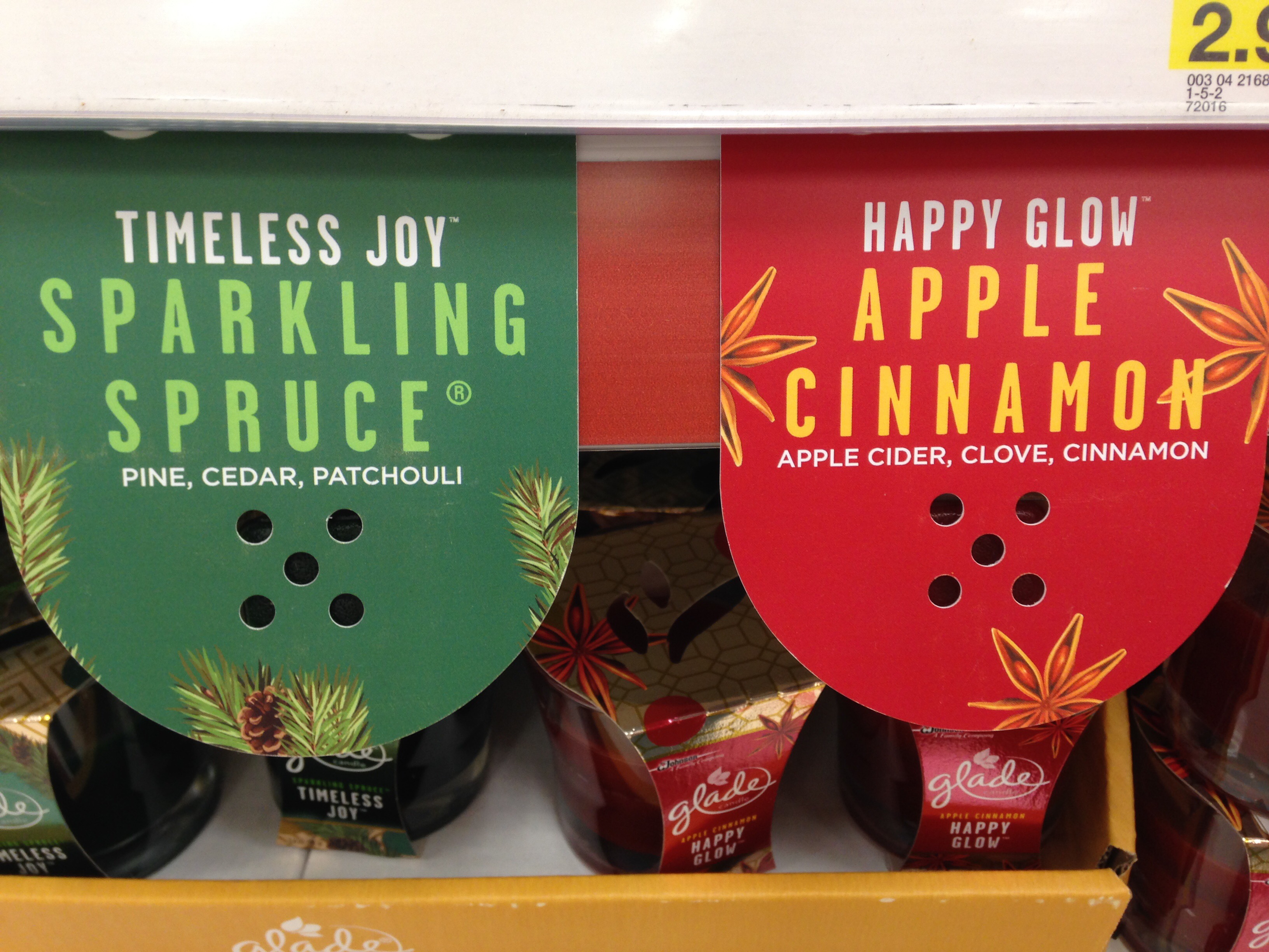 So far, I saw all four scents as jar candles and plug-ins (Walmart and Target). I saw Happy Glow (Apple) and Timeless Joy (Spruce) as wax melts, auto-spray refills, and solid air fresheners at Target. I didn’t see wax melts or room sprays at our Walmart, but it had auto-spray refills of apple and spruce. I didn’t see wax melts of Merry Fun (vanilla) or Shimmering Wonder (plum blossom) anywhere yet. I’m guessing maybe Dollar General will have one of those (which I would check if there was a Dollar General closer to my home). The Target had a $1 room spray in all except the vanilla scent. But I saw the vanilla room spray at a larger Giant grocery store (which, instead, doesn’t have the plum blossom room spray). I’m guessing there will be another exclusive somewhere, maybe?