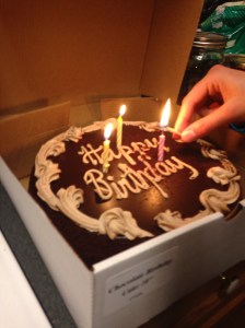 It was a somewhat rich and dense chocolate cake, a texture that probably holds up better for long distance travels. The entire cake including the frosting and “Happy Birthday!” decorations made it through surprisingly well. I have one small piece left, and it isn’t even totally gross. Pretty darn good still.