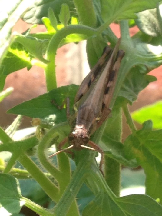 While watering my balcony plants this morning I discovered I had a visitor. A grasshopper was perched high on my Celebrity tomato plant. (That’s the name of a hybrid tomato — it isn’t that my tomato plant is famous). We’re four flights up on this side of the building, so some of our balcony visitors are quite a surprise.