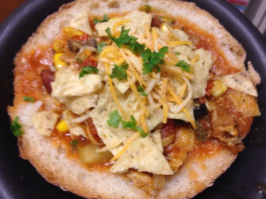 Made a really yummy Tortilla Soup for dinner complete with a few balcony tomatoes, peppers, and herbs. My kiddo had hers in a bread bowl (pictured below) because bread bowls are yummy.